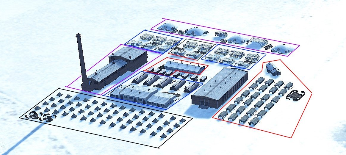 OBJECTIVES Objectives: Factory 25% per Point Encampment 25% per Point Prison rescue 4 Points Convoy 2 Point Train 2 Points City Objective Victor = one point gained, Loser = one point lost On-Map intel and scoreboard: EIF has real-time "percentage" destroyed intel for the factory and encampment which are displayed on-map next to the encampment/factory target icons. Also a real time scoreboard of Axis/Allied points gained and lost (tank captures) is displayed above the battle area of the in-game map. AAA battalion: "Objectives" have defensive AAA batteries, each battalion consisting of 3 batteries of 3 guns (20mm thru 88mm). Defensive Batteries are located in and around the objective's perimeter, out to a distance of approximately 5 KM. Guns destroyed do not re-spawn, and are not part of an objectives value. Suppressed guns (crew runs away) will have crews returned within 5 to 10 minutes. Airfields: Plane-sets are limited. Refuel and Rearm is available for all aircraft at any active airfield. Airfields also have destroy-able, Refuel and Rearm vehicles. The Refuel and Rearm vehicles, once destroyed, do not re-spawn. De-spawning aircraft will be placed back into an airbases inventory if that airfield contains that type of aircraft and only if the "types" inventory has been reduced, including type currently in use. De-spawning "not at Home Base" could result in lost aircraft. Trains: Trains have random start times and routes, and are not indicated on the map. Trains are also defended by on-board AAA. Note that only the locomotive counts for destruction of the Train. All train cars / AAA cars do not count toward Train destruction. Convoy: A convoy is made up of 10 cargo trucks and 2 AAA vehicles. Destroy 7 of the 10 cargo trucks for the points. AAA trucks do not count toward Convoy destruction. Active Supply columns are indicated on the map by an "as the crow flies" black line, designating its start and end points only. Supply columns are "on-road" , but choose their own roads to their destination. The convoy's start and destination points could change from week to week. The time it spawns is random and could be at any time within the mission. Factory: The Area target is organized randomly into 9 Sections of mission editor "object group's". Destroy 50% of a group, destroys that group. Destroy 50% of the "Group's" with-in a section, destroys that "Section". (indicated by a medium smoke) Each Section is 12% of the total. Counted at 25% intervals for points, and seen on the in-game map. (Sections can contain powder bags and/or ammo crate's which have increased explosive destruction power beyond the other Sections). A few "objects" may not be part of any Section. Sections are the same for Red and Blue, but their arrangement are different. Encampment: The Area target is organized randomly into 9 Sections of mission editor "object group's". Destroy 50% of a group, destroys that group. Destroy 50% of the "Group's" with-in a section, destroys that "Section". (indicated by a medium smoke) Each Section is 12% of the total. Counted at 25% intervals for points, and seen on the in-game map. (Sections can contain powder bags and/or ammo crate's which have increased explosive destruction power beyond the other Sections). A few "objects" may not be part of any Section. Sections are the same for Red and Blue, but their arrangement are different. Prison Rescue: Destroy the 2 "command buildings" and "gate house". The prisoner vehicle will spawn at the nearest airfield to the Prison compound and begin firing flares. Land the "Rescue Aircraft" at that airfield. Engine off is not required but being at a complete stop is. All players on the same side as the Prisoner Rescue aircraft will receive a "wait a few moments for prisoner to board", then a few minutes later a "prisoner on board" in-game message. Fly the prisoner to its Home airfield. Land the prisoner with in the airfield perimeter. Wait while stationary, to receive the in-game message of "prisoner rescued" (engine off not required). Gained points after the mission complete are visible on the in-game/on map score board. After Prison Rescue mission complete the Prison rescue icon on the map disappears. Ground Forces: Tank Battalions: Ground battles are fought between Divisions. Each Division is broken down into Battalions. Each coalition Division has four Battalions: One HQ Battalion and three regular Battalions Each Battalion (spawn point) also has a capture flag and defensive assets. (see defensive assets:) When an enemy vehicle enters with in the battalions capture zone, the spawn location is turned neutral, and no vehicles can spawn. If the enemy vehicles are expelled before the Battalion is captured, the spawn will return to friendly hands and will be usable. However, if the Battalion is captured, it shuts down the spawn location for the rest of the game session, or until the base is recaptured. Destroying the Fuel and Ammunition crates under 3 nets, in a battalion, can also neutralize the "Spawn" for a 20min period. The spawn will reset after the 20 mins. including the fuel and ammo, if no other action(s) takes place. Tanks do not have the RRR options at the Battalions, but can be able to rearm and refuel at FOBs (see the FOB section of the rules), Tankers have unlimited lives and can be multi-crewed. Note: captured battalions do not count for points. Only dual flagged "capture points" within the city will count for points. Defensive Assets: Battalions and Divisions have AI manned defensive assets (Static tanks/anti tank guns). Also there are "objects" with in the Battalions or Divisions that not considered as assets (fuel tanks, trucks, etc.) Defensive assets can be ether destroyed or their "crew" dislodged (Guns) in order to capture. An Asset with a dislodged crew at capture will return after 5 to 10 minutes and re-capture the base. Only destroyed assets are permanently destroyed and do not re-spawn in order to permanently perform a capture. Artillery 